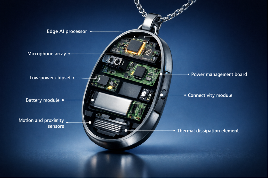 • Embedded sensors: Motion, proximity, and environmental sensors help the pendant understand user activity and context.